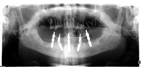 经过前期的牙周清洁、治疗后,根据李老口内实际情况,为达到更好的增加负重、增强咀嚼能力效果,麦芽口腔种植医师团队对ALL-ON-4种植技术进行升级和改造,为其量身定制了"ALL-ON-5"种植方案,治疗后总共恢复24颗牙齿。