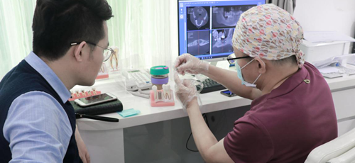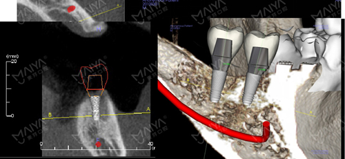 完成的影像数据、及三维数据模型,经数据云传输至MAC数字化精确方案设计中心,通过AI人工智能软件、循证医学病例数据库,融入咬合关系、基台牙冠等修复信息,完成咬合关系重建、模拟种牙理想路径,实现“以修复为导向”的种植方案设计。