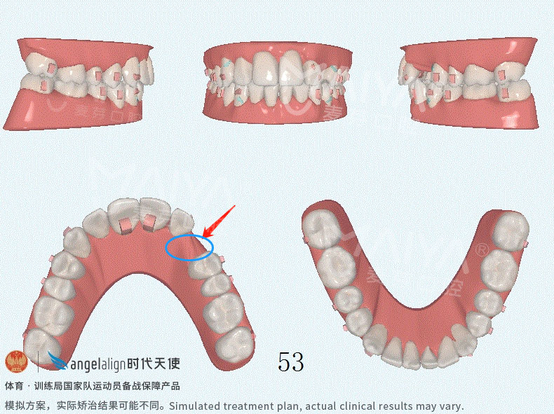 矫正后牙齿各个面3D动画(图上标注处需要待牙齿排齐后再种一颗牙)