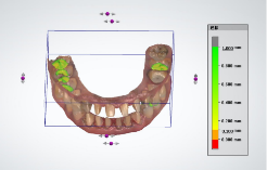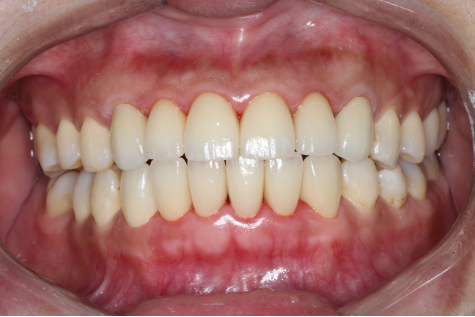 1、将牙龈作激光环切处理,同时上下颚的烤瓷牙做拆冠制作,按照色标的参数值,初步检查咬合接触关系。