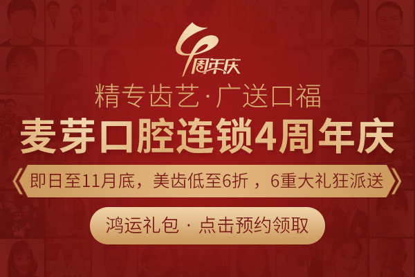 值此麦芽口腔四周年庆之际,为感谢广大顾客长期以来的关注与支持,麦芽口腔特推出年度盛惠。11月16日 — 12月31日,麦芽口腔美齿低至6折,进口植体特价3600元,青少年正畸特价6980元,烤瓷牙特价780元,消费满额抽大奖,预约享AI智能口腔体检,领周年庆红包,更可获得麦芽硕博专家团一对一亲诊,机会难得,先约先得!咨询热线:0755-8233 9968。