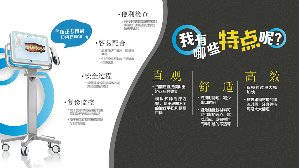 牙齿不齐各有不同,想提前预知矫正效果?神奇的黑科技网红口扫仪让您提前预见矫牙后的效果!高效3D数字化扫描 3-8 分钟完成取模,MAC数字化精确数据采集中心,通过CBCT与数字化口扫组合的形式,360°全方位提取数据,实时重建三维牙模,避免传统取模的边缘性误差与过程中造成的不适感,基于前期对患者精确的MAC数字化三维数据采集及MAC数字化取模,借助 AI人工智能软件,和数以百万的病例库模拟计算,分析得出治疗建议,尊享私人定制的精确治疗方案。 当天让您预知变美后矫正效果,节省一个月的等方案时间,让矫牙变得更高效。